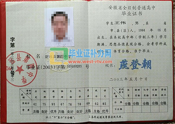 滁州市定远县第四中学高中毕业证样本图