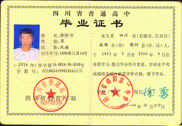 四川省绵阳第一中学高中毕业证样本图