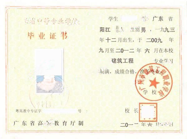 广州建筑工程职业学校中专毕业证样本信息