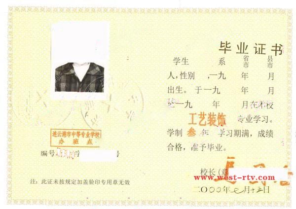 江苏省东海县职业中学1995-2000年中专毕业证样本