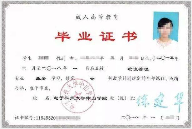 电子科技大学中山学院2018年成人教育毕业证样本图